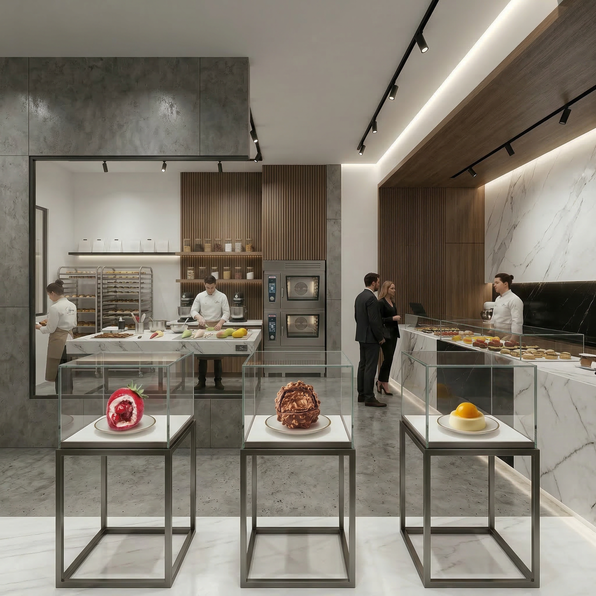 Nuestro obrador blanco y ébano trabaja tras ventanales, con chefs creando piezas a mano. Dentro, paredes blancas, vitrinas negras y mostrador de madera custodian ilusiones crujientes que esconden cremas efímeras —exclusivo centro Valencia.